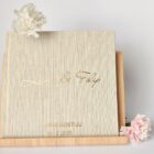 Zabilježite najljepše uspomene vašeg vjenčanja u elegantnoj personaliziranoj Knjizi gostiju, dostupnoj u cvjetnom ili bež platnenom dizajnu. Naslovnica je ukrašena zlatnim foliotiskom s vašim imenima i datumom vjenčanja – kako bi svaki pogled na ovu knjigu podsjetio na dan kada ste rekli „da“.