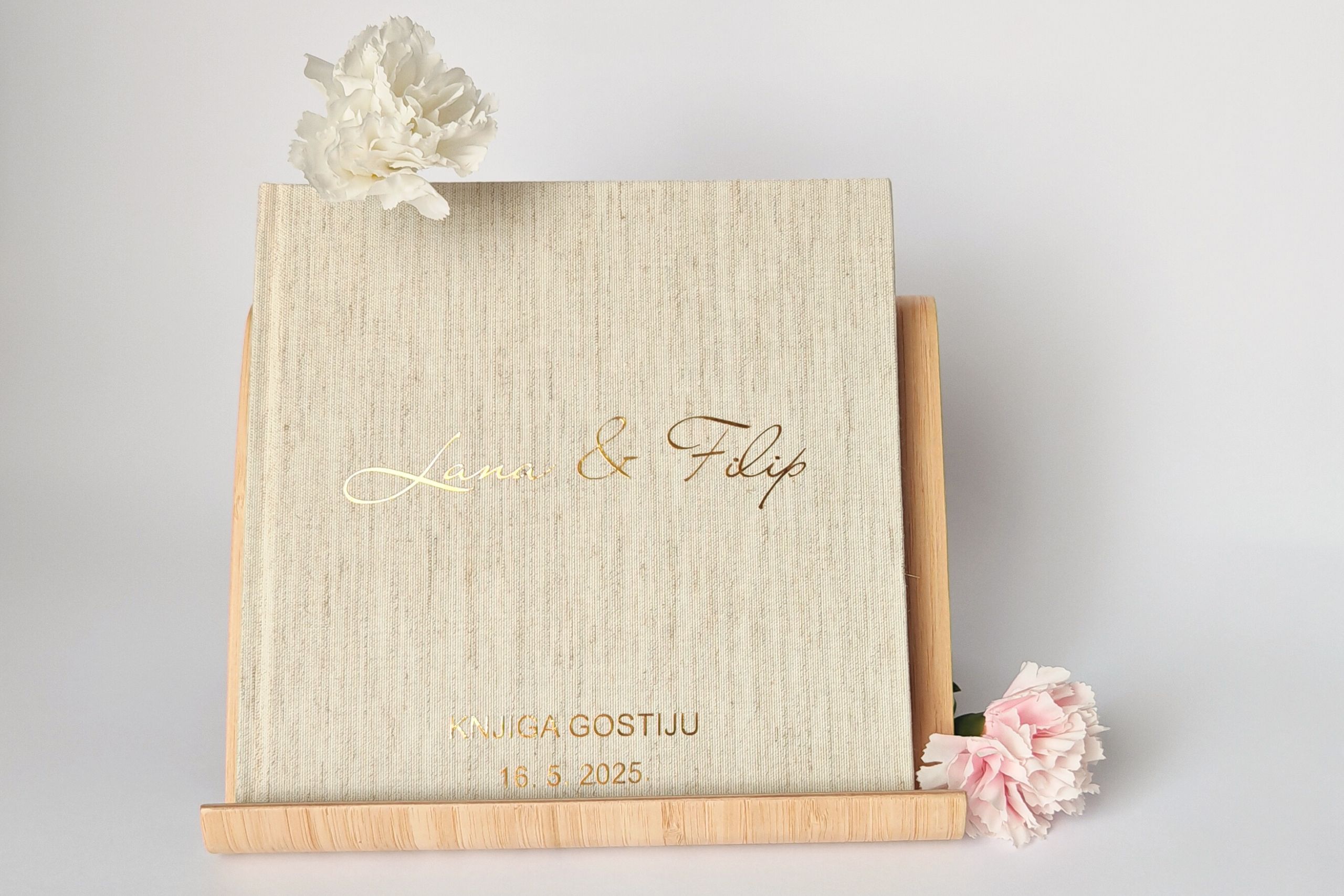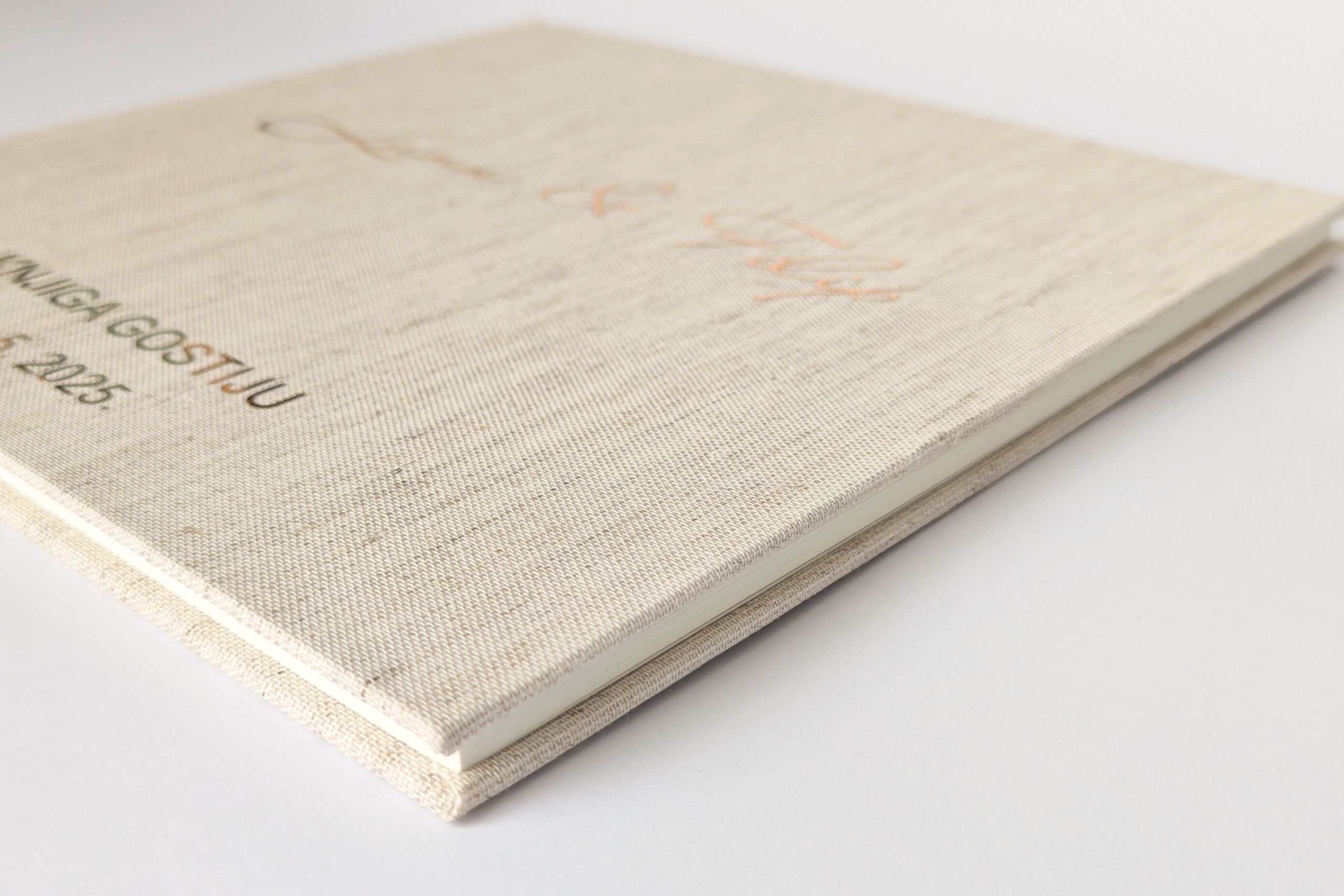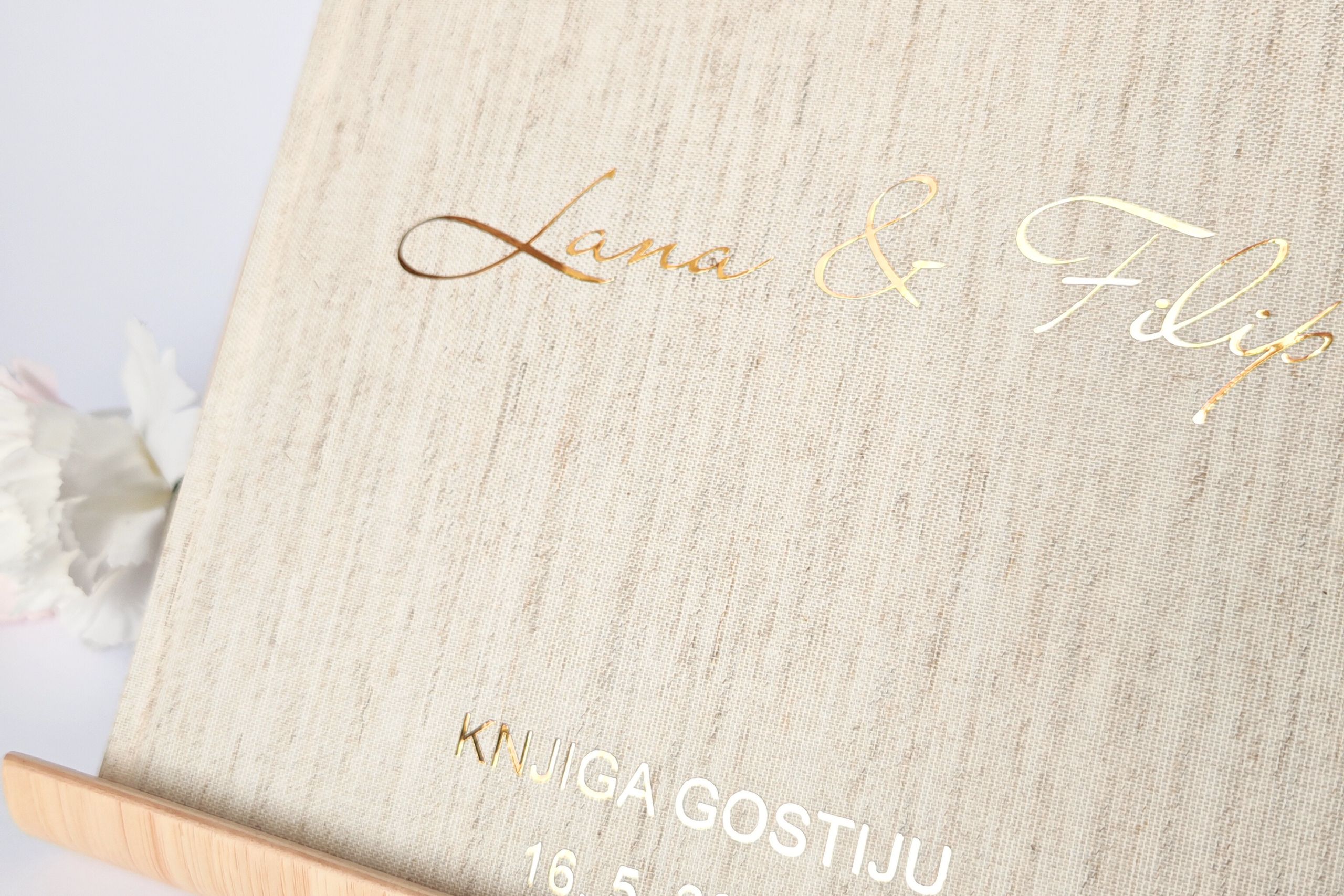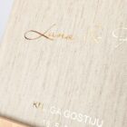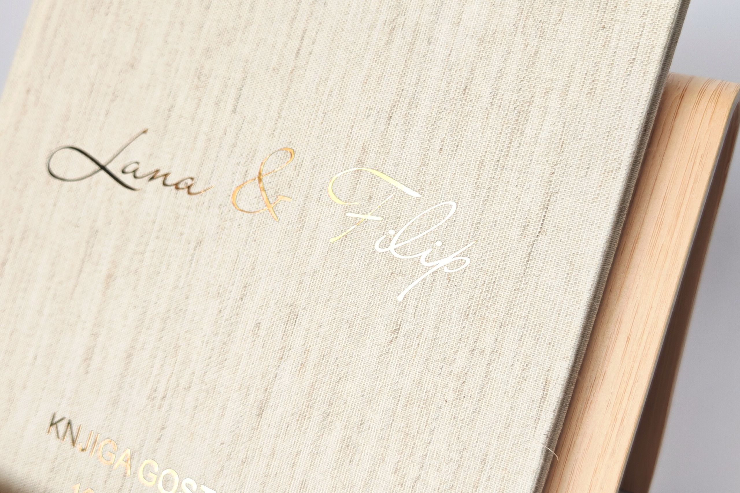 Personalizacija naslovnice uključuje zlatni foliotisak s imenima mladenaca, natpisom “Knjiga gostiju” i datumom vjenčanja.