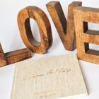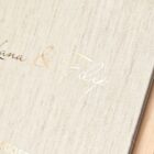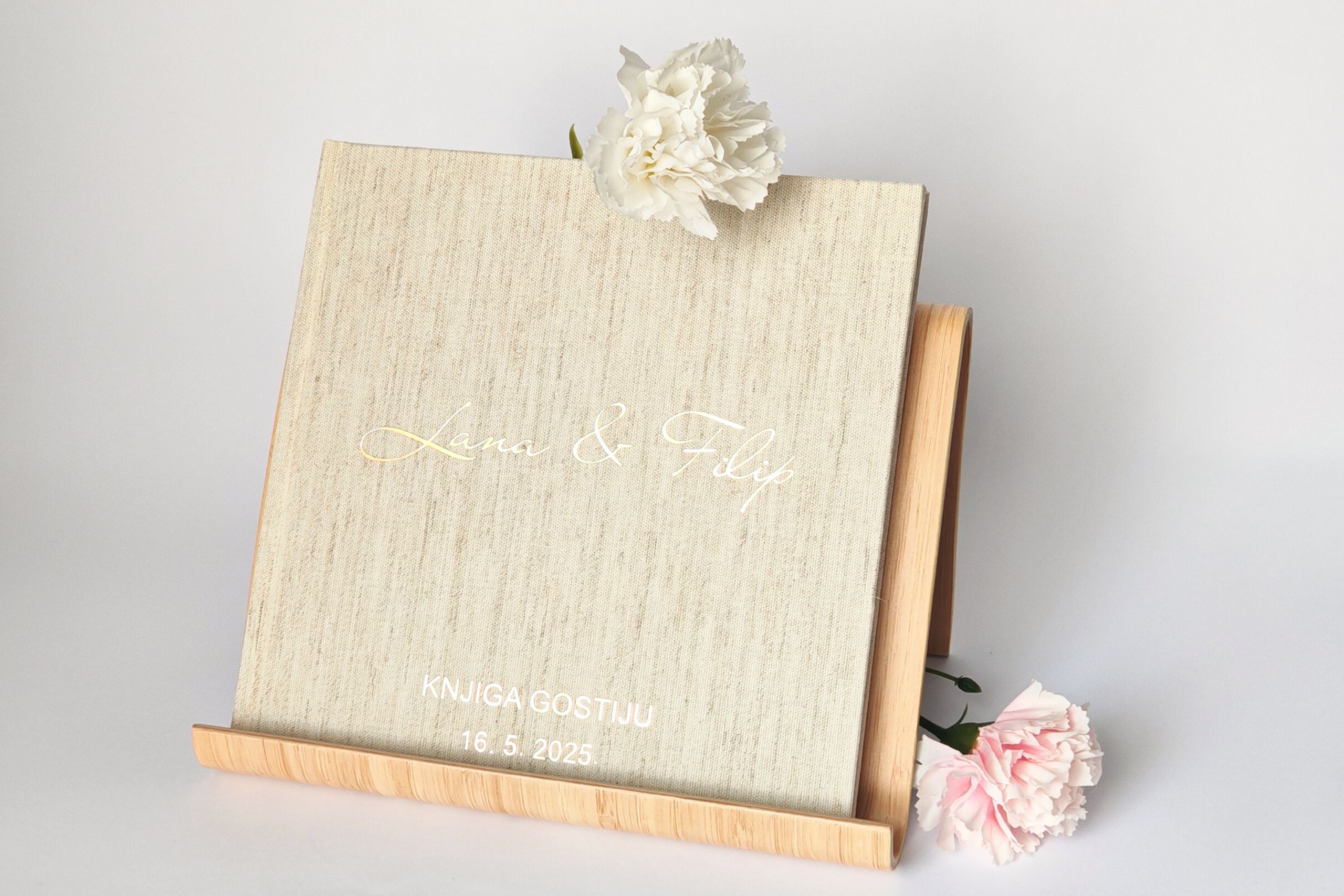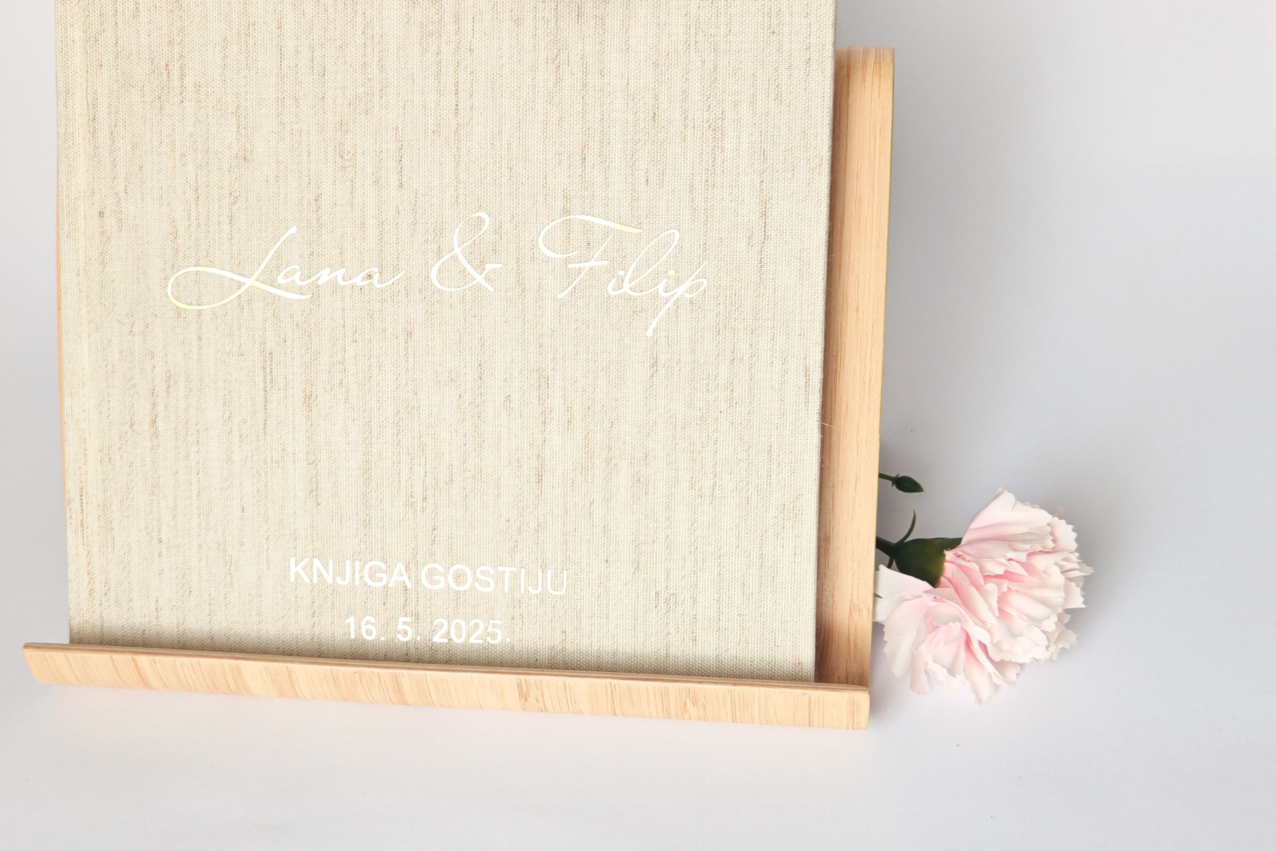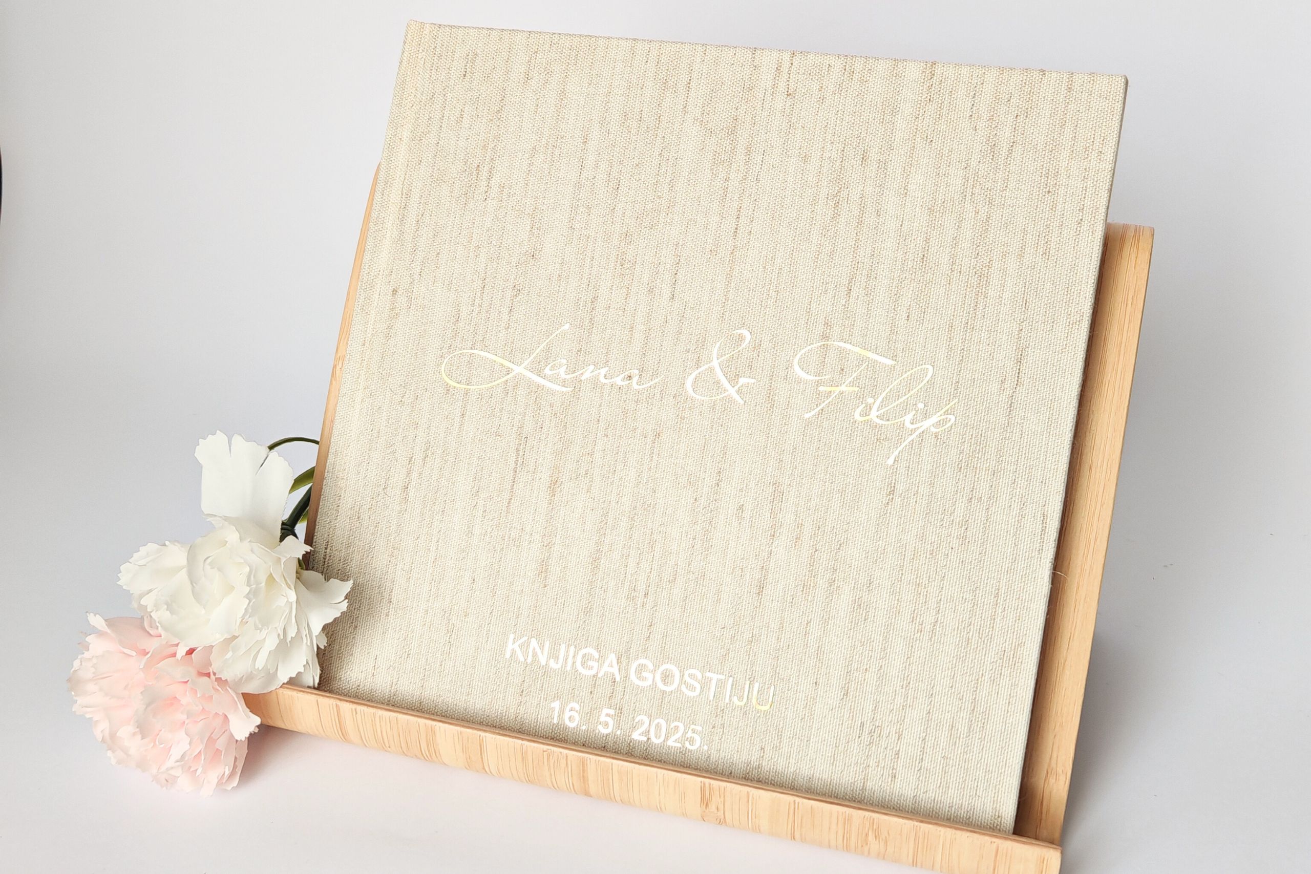 Personalizacija naslovnice uključuje zlatni foliotisak s imenima mladenaca, natpisom “Knjiga gostiju” i datumom vjenčanja.